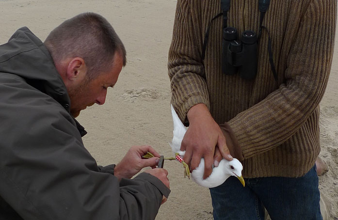 Od 2011 r. znakowane są kolorowymi obrączkami mewy siwe lubelskiego odcinka Wisły, oraz "duże" mewy, głównie białogłowe, gniazdujące w kolonii lęgowej na Jeziorze Wytyckim. W ramach projektu obrączkowane są zarówno ptaki dorosłe, jak i młode. Każdy ptak otrzymywał dwie obrączki. Obrączkę plastikową zakładano na prawy skok, na lewy zaś zakładano standardową metalową obrączkę centrali.  Głównym celem jest poznanie migracji i przemieszczeń mewy siwej oraz białogłowej/srebrzystej, gnieżdżących się na Lubelszczyźnie. Celem jest również próba zbadania struktury taksonomicznej dużych mew Larus argentatus/Larus cachinnans gnieżdżących się we wschodniej części Lubelszczyzny. Zastosowanie kolorowych obrączek znacznie ułatwia ich odczytanie w terenie, wystarczy lornetka lub luneta do poprawnego odczytania kodu i co ważne - nie ma potrzeby ponownego chwytania ptaków. W 2011 roku mewy siwe obrączkowano czerwonymi obrączkami a mewy białogłowe otrzymały żółte plastiki. Zachęcamy wszystkich do zwracania szczególnej uwagi na te gatunki. Jeśli zauważysz mewę z obrączką postaraj się odczytać numer i zawiadom nas o tym, podając kod literowo/cyfrowy umieszczony na obrączce, oraz miejsce i czas obserwacji. W zamian otrzymasz informację o historii obserwowanego ptaka. Wszystkie odczyty z mew prosimy wysyłać za pośrednictwem formularza dostępnego na stronie stacji ornitologicznej, pod adresem http://ring.stornit.gda.pl/ . Mewa siwa (Larus canus) - mapa wiadomości powrotnych. Pokaż Mewa siwa (Larus canus) - wiadomości powrotne na większej mapie