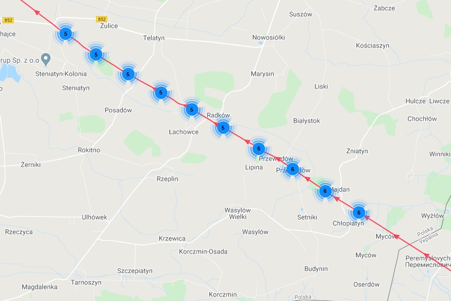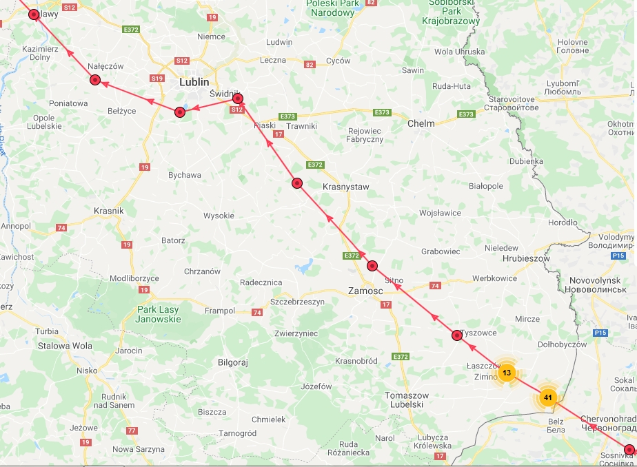 Nocny przelot ostrygojada "Saszy" nad Lubelszczyzną. Ptak wyposażony w loger GPS o 2 w nocy latał nisko w ujściu Bystrzycy do zalewu. Wystartował 9 kwietnia znad Morza Czarnego w Rumunii.